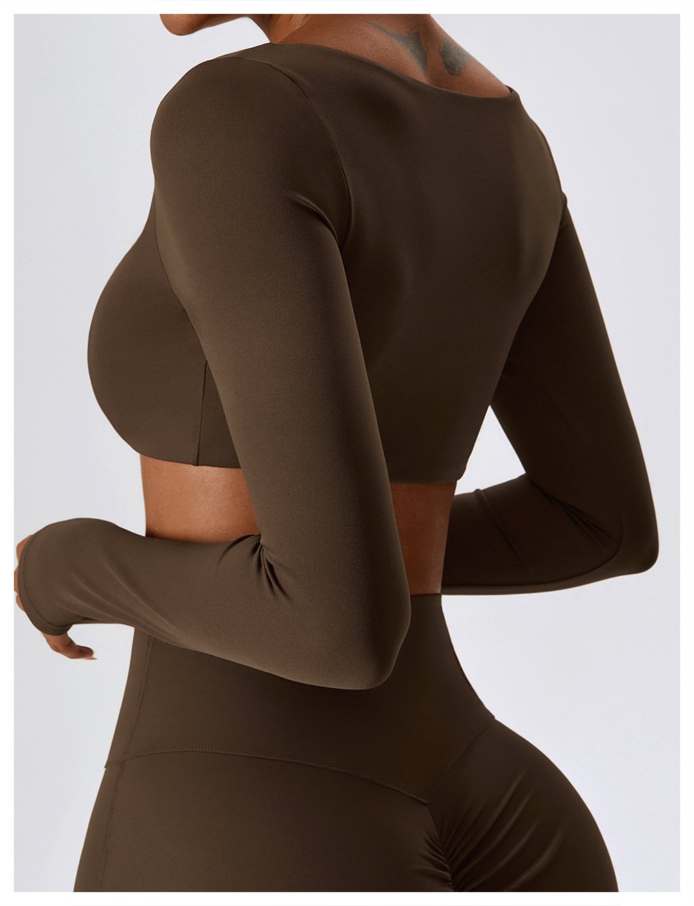 Ensemble deux pièces composé d’un pantalon flare patte d’éléphant et d’un crop top à manches longues.